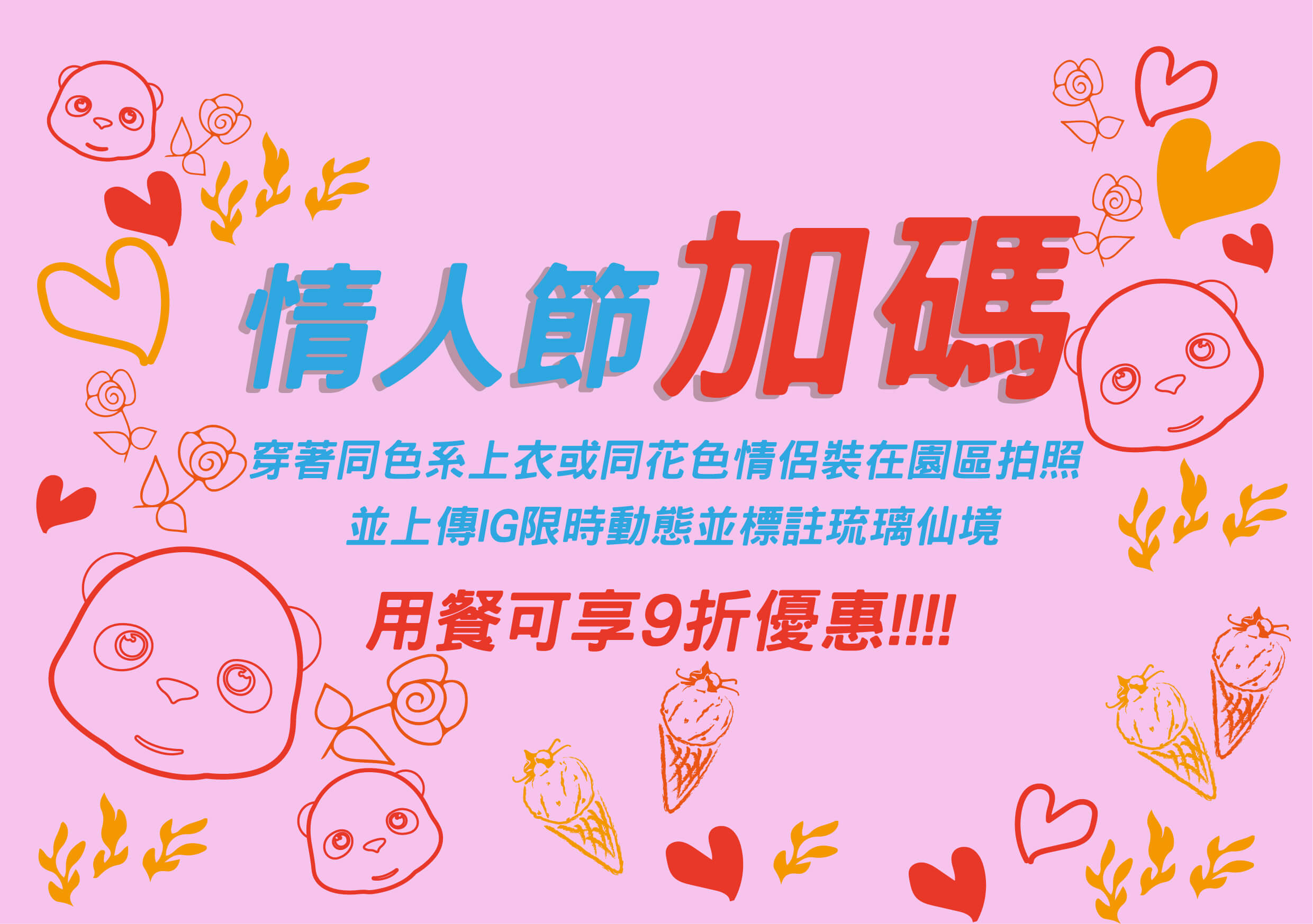 穿著同色系上衣或同花色情侶裝在園區拍照,並上傳IG限時動態標註琉璃仙境